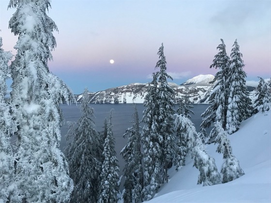 Moon-rise and sunset over a wintry Crater Lake