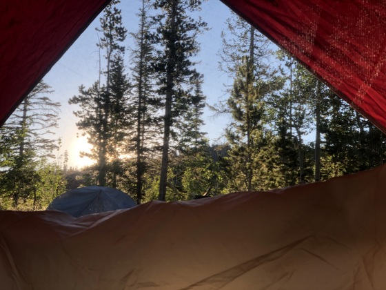 Peeking out to check on a friend's tent in the early morning light at Lake Owen.