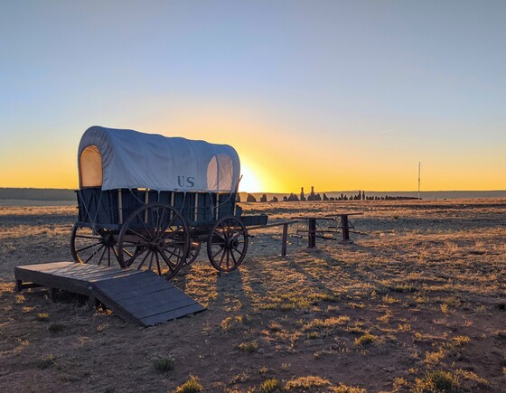 The sun sets behind the ruins of the US Civil War era Fort Union. A freight wagon typical of the type used to transport supplies to and from the depot sits in the foreground. A flag pole stands tall at the center of the fort complex.