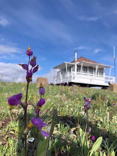 Shooting star, native wildflower coats the spring ground, Monument Peak Rental Cabin in background