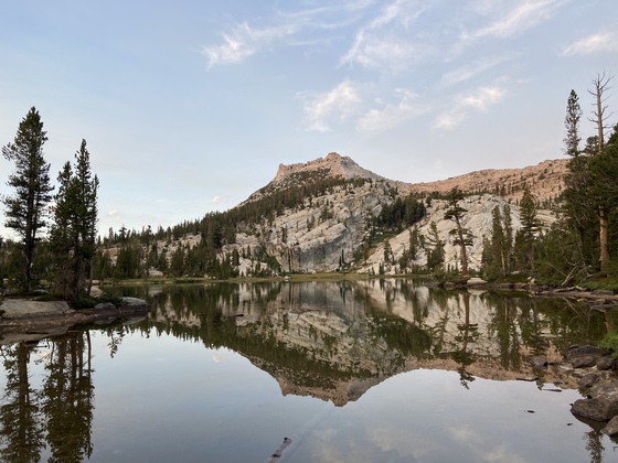 Upper Cathedral Lake with Tresidder Peak reflected in the water.