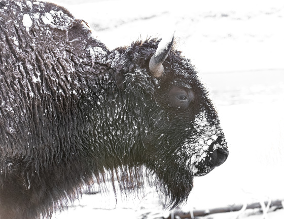 A snowy bison in Hayden Valleyduring after an early October snow.