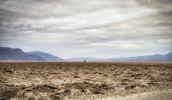 A visitor next to his vehicle walks alone in the immense expanse of Devils Golf Course in Death valley.
