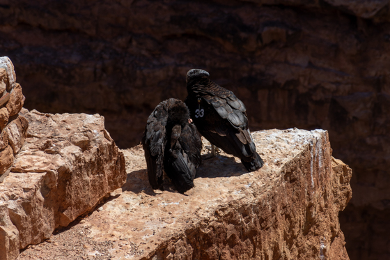 Two juvenile California Condors preen in the sun on a rocky outcropping next to Navajo Bridge